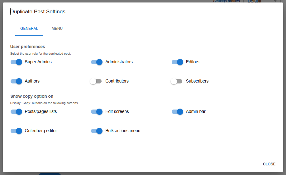 Only users with enabled roles will see copy and duplicate options in the WordPress admin.